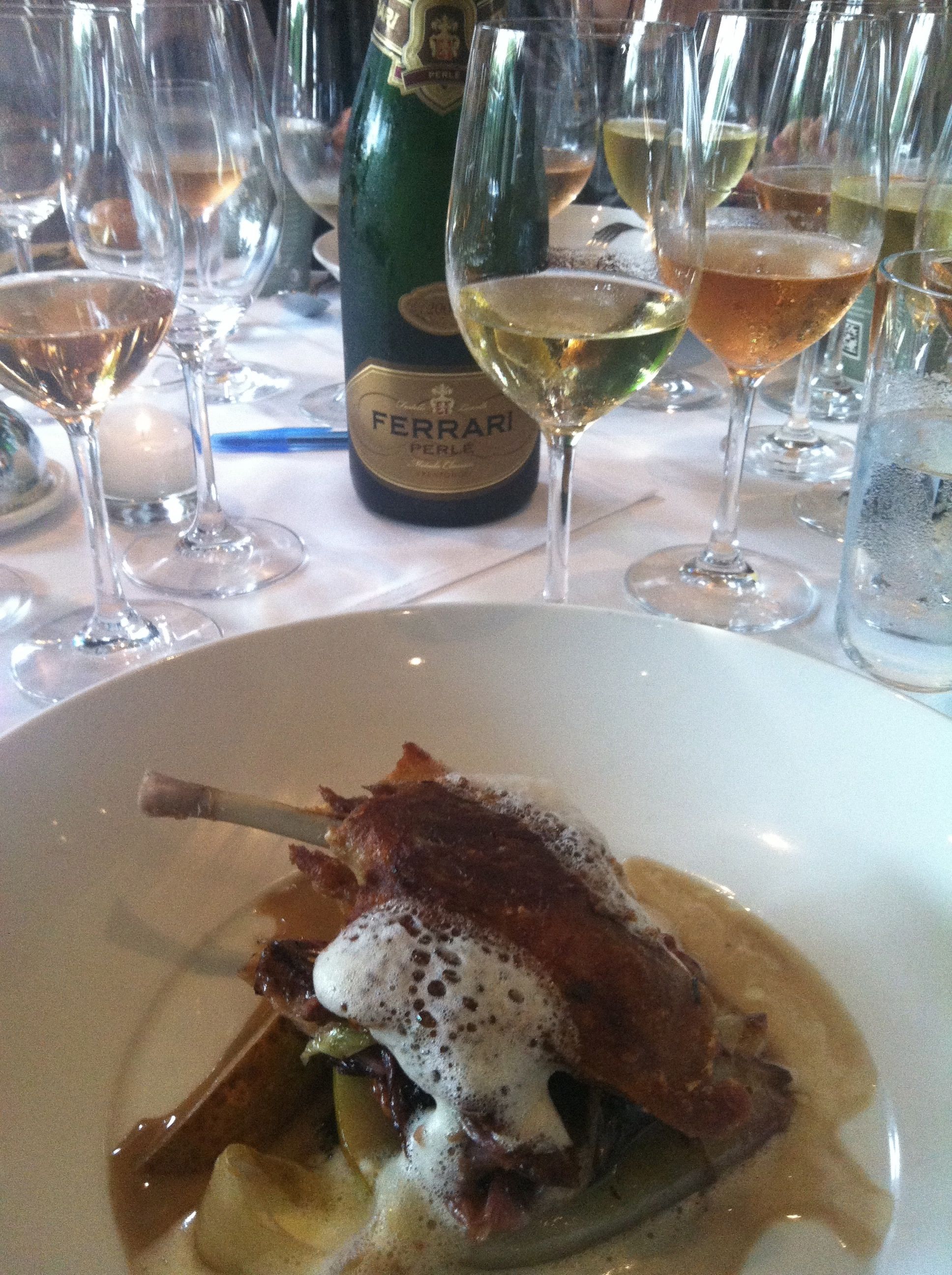 At Spruce SF, duck leg confit with pears and roasted endive paired beautifully with the Ferrari Brut Rosé and the Perlé Rosé a vintage wine with pinot noir and chardonnay from special vineyards. Yes, sparkling wine is perfect for pairing with food.